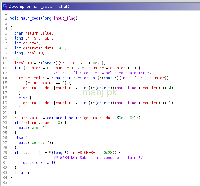 this function is taking one character from user input and passing its ASCII integer value to “remainder_zero_or_not” function which perform basically a modulus operation on it, if it is an even number the function returns 0 or 1 if it is odd and in response to the return value, in case of 0 return the shr(shift bitwise right) operation will be performed 4 time on said chracter value or 1 time if it returns 1 and the modified value will be saved in a memory location i named (generated_data).